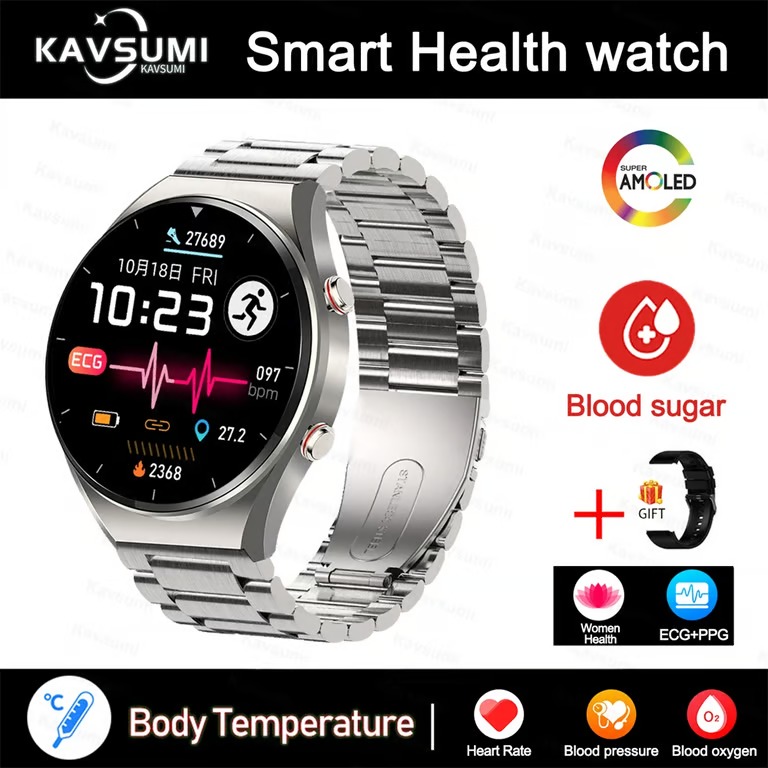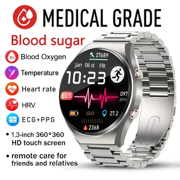 New Noninvasive Blood Gloucose ECG+PPG Men Heart Rate Blood Oxygen Health Waterproof Sport Smartwatch Silver
